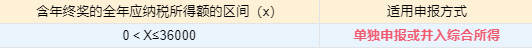 年終獎選擇兩種方式都可以。 (3)當年收入(含年終獎)減去6萬及三險一金、附加扣除等后應納稅所得額>36000 當含年終獎的全年應納稅所得額大于36000時,由于年終獎單獨申報存在雷區(qū)等原因,為使稅負最低,可在年終獎和工資之間進行分配,分配的年終獎按照全年一次性獎金單獨申報。