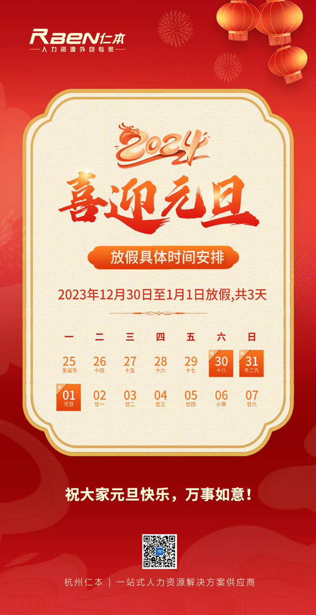 放假時間:2023年12月30日(周六)至2024年1月1日(周一),共計3天。2024年1月2日(周二)正常上班。