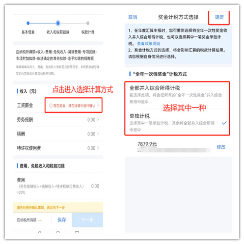 3月1日,2023年個人所得稅匯算清繳正式啟動。不少網友曬出自己匯算賬單:退稅金額從幾十元、幾百元、上千元乃至上萬元不等;補稅金額也是幾百元、幾千元甚至上萬元。 根據中國國際稅收研究會課題組研究,2019年和2020年辦理個稅匯算清繳的,差不多近一半享受了退稅,兩年平均退稅金額約581元。因此對多數人來說,大概率會獲得退稅。而由于400元以內補稅金額可以豁免,不用補繳,因此不退不補人數占參加匯算清繳申報人數比重超過40%,真正需要補稅人數占比在3%左右哦~ 這次個稅匯算辦理時間為2024年3月1日至6月30日,納稅人如需在3月1日至20日之間辦理匯算,可在2月21至3月20日(每日6:00—22:00)通過個稅APP預約。3月21日至6月30日,無需預約,可隨時辦理。 政策要點有哪些?具體怎么辦?一起了解一下吧↓ 如何辦理退、補稅? 怎么計算需要補稅還是退稅?先來看一下具體的計算公式: 應退或應補稅額=[(綜合所得收入額-60000元-“三險一金”等專項扣除-子女教育等專項附加扣除-依法確定的其他扣除-符合條件的公益慈善事業捐贈) x 適用稅率-速算扣除數]-已預繳稅額 辦理退稅? 納稅人申請匯算退稅,應提供在中國境內開設的符合條件的銀行賬戶。稅務機關按規定審核后,按照國庫管理有關規定辦理稅款退庫。納稅人未提供本人有效銀行賬戶,或者提供的信息資料有誤的,稅務機關將通知納稅人更正,納稅人按要求更正后依法辦理退稅。 為方便辦理退稅,2023年綜合所得全年收入額不超過6萬元且已預繳個人所得稅的納稅人,可選擇使用個稅APP或網站提供的簡易申報功能,便捷辦理匯算退稅。 申請2023年度匯算退稅及其他退稅的納稅人,如存在應當辦理2022年及以前年度匯算補稅但未辦理,或者經稅務機關通知2022年及以前年度匯算申報存在疑點但未更正或說明情況的,需在辦理2022年及以前年度匯算申報補稅、更正申報或者說明有關情況后依法申請退稅。 辦理補稅? 納稅人辦理匯算補稅的,可以通過網上銀行、辦稅服務廳POS機刷卡、銀行柜臺、非銀行支付機構等方式繳納。郵寄申報并補稅的,納稅人需通過個稅APP及網站或者主管稅務機關辦稅服務廳及時關注申報進度并繳納稅款。 匯算需補稅的納稅人,匯算期結束后未申報補稅或未足額補稅的,一經發現,稅務機關將依法責令限期改正并向納稅人送達有關稅務文書,對已簽訂《稅務文書電子送達確認書》的,通過個稅APP及網站等渠道進行電子文書送達;對未簽訂《稅務文書電子送達確認書》的,以其他方式送達。同時,稅務機關將依法加收滯納金,并在其個人所得稅《納稅記錄》中予以標注。 納稅人因申報信息填寫錯誤造成匯算多退或少繳稅款的,納稅人主動或經稅務機關提醒后及時改正的,稅務機關可以按照“首違不罰”原則免予處罰。 兩種年終獎個稅計算方法,哪種更有利? 在申報中,辦理個稅匯算面臨全年一次性獎金計稅方式的兩大選擇:全部并入綜合所得計稅和單獨計稅。 單獨計稅,即以全年一次性獎金收入除以12個月得到的數額,按照按月換算后的綜合所得稅率表,確定適用稅率和速算扣除數,單獨計算納稅; 全部并入綜合所得計稅,就是將獎金納入綜合所得收入,按綜合所得超額累進稅率來計稅。 單獨計稅其實是一項優惠政策,去年被延續至2027年底。因此對多數人來說,選擇單獨計稅方式,年終獎可以少繳個稅。但對那些全年工資相對少,年終獎相對多的人來說,可能選擇將年終獎并入綜合所得計稅方式更省稅。 要辨別獎金哪種計稅方法對自己更有利,一個最簡單方法是,在個稅APP中先選擇某一種計稅方式,看看最終匯算后的交稅金額,然后不要確認,返回再選擇另一種計稅方式,比較兩種方式下,哪種稅額小,就選擇哪種。 個稅專項附加扣除 由于2023年國務院將3歲以下嬰幼兒照護、子女教育、贍養老人三項專項附加扣除每個月標準均提高1000元,從而進一步減輕家庭撫養贍養負擔。這也會使得今年個稅匯算清繳中,更多的人將享受這筆退稅紅包。 因此,對于2023年可以享受上述三項附加扣除但未申報個人,可在匯算清繳時補充申報,以充分享受國家稅收優惠。 國家稅務總局近日也發布公告明確,一些項目可在個稅匯算期間填報或補充扣除。一圖帶你了解具體內容↓↓ 個稅匯算清繳具體操作 居民個人2023年度綜合所得年收入額超過6萬元時,可以在3月1日至6月30日內,通過標準申報辦理年度匯算。居民個人取得境外所得的,可到WEB端或辦稅服務廳辦理。 個稅APP標準申報操作步驟來了: 步驟一:開始申報 有預約的,可以在預約時間辦理,進入【個人所得稅APP】首頁,點擊【開始申報】開啟2023個稅匯算清繳。 沒有預約的,先進行預約。 3月1日起,2023年度個稅綜合所得匯算開始。納稅人如需在3月1日至20日之間辦理匯算,可在2月21至3月20日(每日6:00-22:00)通過個稅APP預約。3月21日至6月30日,納稅人無需預約,可以隨時辦理。 步驟二、核對基礎信息、選擇匯繳地 2023年收入額大于6萬元的,系統會默認“標準申報”;如果2023年的收入額未超過6萬元且已預繳稅款,就會進入“簡易申報”流程,確認數據無誤后,提交即可。 步驟三、核對收入和稅前扣除信息 (1)選擇年終獎計算方式 年終獎可以單獨計稅,也可以合并到綜合所得稅中計稅,哪種方式交稅少,選擇有利于自己的方式。 (2)核對收入、扣除信息 (1)核對、完善收入情況 在收入列表,您可分