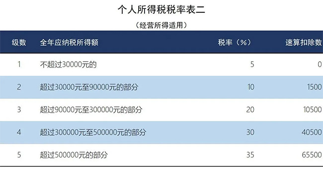 非居民個人的工資、薪金所得,以每月收入額減除費用五千元后的余額為應納稅所得額;勞務報酬所得、稿酬所得、特許權使用費所得,以每次收入額為應納稅所得額。 勞務報酬所得、稿酬所得、特許權使用費所得以收入減除百分之二十的費用后的余額為收入額;其中,稿酬所得的收入額減按百分之七十計算。 5、經營所得稅率表