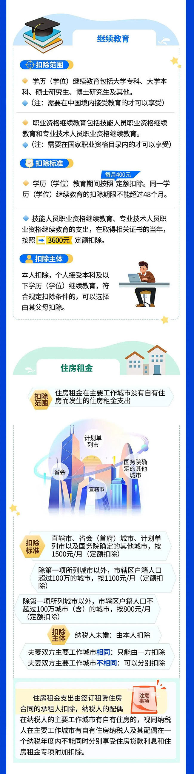 政策內容: 一、3歲以下嬰幼兒照護專項附加扣除標準,由每個嬰幼兒每月1000元提高到2000元。 二、子女教育專項附加扣除標準,由每個子女每月1000元提高到2000元。 三、贍養老人專項附加扣除標準,由每月2000元提高到3000元。其中,獨生子女按照每月3000元的標準定額扣除;非獨生子女與兄弟姐妹分攤每月3000元的扣除額度,每人分攤的額度不能超過每月1500元。 四、3歲以下嬰幼兒照護、子女教育、贍養老人專項附加扣除涉及的其他事項,按照《個人所得稅專項附加扣除暫行辦法》有關規定執行。 五、上述調整后的扣除標準自2023年1月1日起實施。 專項附加扣除每個月標準提高,意味著能夠享受上述扣除的納稅人,可以扣除更多的應納稅額,從而少交個稅,增加到手收入。 那么,調整后,每個人到底可以增加多少收入?這跟每個人的具體情況息息相關。 02、到底能增加多少收入? 由于目前一年個稅起征點(基本減除費用)為6萬元,再疊加7項專項附加扣除等各類扣除項目,實際起征點更高。 對于無需繳納個稅的人群,“一老一小”扣除標準提高與否,對他們并無影響。真正影響的是繳納個稅且有老人孩子的納稅人。 對于這些人而言,假如有兩個孩子,“一老一小”扣除標準每月提高1000元,最高能比之前多享受每月3000元個稅扣除額,一年則是36000元。如果該人適用最高的45%個稅邊際稅率,那么,理論上可享受1.62萬元個稅減稅額。當然,如果有更多的孩子,可以享受更高的扣除額度,到手收入會更高。 不過,贍養岳父母或公公婆婆是不能享受贍養老人專項附加扣除的。根據現行政策規定,贍養老人專項附加扣除政策中的老人(被贍養人),是指年滿60歲的父母,以及子女均已去世的年滿60歲的祖父母、外祖父母,不包括配偶的父母。 03、最全個人所得稅扣除項目