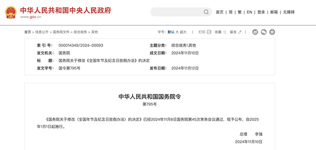 1、明年起法定節假日增加2天 11月12日,國務院發布第795號《中華人民共和國國務院令》,對《全國年節及紀念日放假辦法》作如下修改: