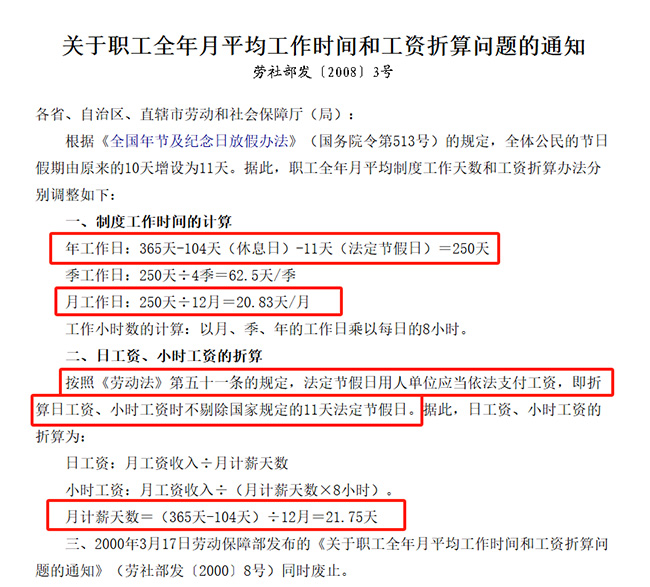 二、職工全年月平均工作時間和工資折算(新算法): 1、制度工作時間的計算 (1)年工作日:365天-104天(休息日)-13天(法定節假日)=248天 (2)季工作日:248天÷4季=62天/季 (3)月工作日:248天÷12月=20.67天/月 (4)工作小時數的計算:以月、季、年的工作日乘以每日的8小時 2、日工資、小時工資的折算 按照《勞動法》第五十一條的規定,法定節假日用人單位應當依法支付工資,即折算日工資、小時工資時不剔除國家規定的13天法定節假日。據此,日工資、小時工資的折算為: (1)日工資:月工資收入÷月計薪天數 (2)小時工資:月工資收入÷(月計薪天數×8小時) (3)月計薪天數=(365天-104天)÷12月=21.75天 可以看到的是,月工資計算天數沒有變化。 加班工資計算 依據《工資支付暫行規定》第十三條:用人單位在勞動者完成勞動定額或規定的工作任務后,根據實際需要安排勞動者在法定標準工作時間以外工作的,應按以下標準支付工資: (一)安排勞動者延長平日工作時間的,支付勞動者工資的150%的工資報酬; (二)休息日安排勞動者工作又不能安排補休的,支付勞動者工資的200%的工資報酬; (三)法定休假日安排勞動者工作的,支付勞動者工資的300%的工資報酬。 目前現行算法是: 加班工資=月薪÷21.75×加班天數×所對應的倍數 以上“工資”指的是勞動合同所簽訂的總額,如果勞動合同的工資分為“基本工資”、“崗位工資”、“職務工資”等,應當以各項工資的總和作為基數計發加班費(包含獎金、津貼、補貼等),不能以單獨一項作為計算基數。 |