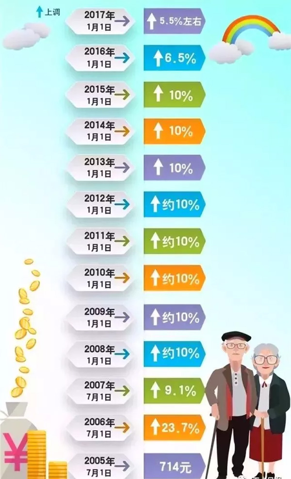 一、養老金十四連漲,2018年漲幅5% 此次調整,繼續統一采取定額調整、掛鉤調整與適當傾斜相結合的調整辦法。定額調整體現社會公平,同一地區各類退休人員調整標準基本一致;掛鉤調整體現“多繳多得”“長繳多得”的激勵機制,使在職時多繳費、長繳費的人員多得養老金;適當傾斜體現重點關懷,主要是對高齡退休人員和艱苦邊遠地區退休人員等群體予以照顧。 自2005年以來,我國養老金已連續上調14年,實現“十四連漲”。此次調整預計將有1.14億名退休人員受益。