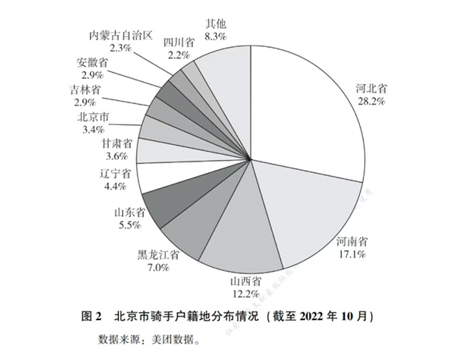 圖源:《北京社會發(fā)展報告(2022~2023)》過去40多年來,我國完成了從“鄉(xiāng)土中國”到“城鄉(xiāng)中國”的巨大跨越,形成全球規(guī)模最為龐大的人口大遷徙現(xiàn)象,大量流動人口以“勞動力紅利”撐起了城市的飛速發(fā)展。 在北上廣深的街頭,你能聽到騎手們天南海北的口音。只要付出汗水,就能拿到不亞于藍領(lǐng)工人的收入,但遺憾的是,很多人最終還是要回到老家養(yǎng)老。