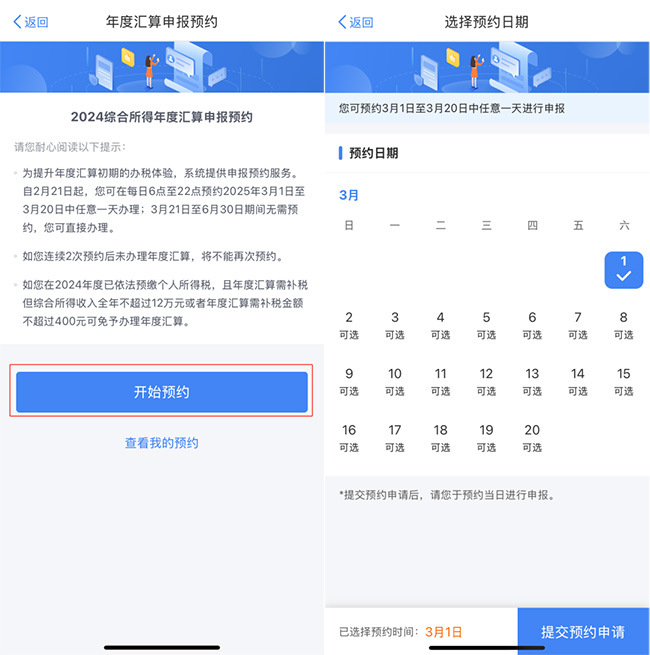 前段時間,國家稅務總局發布了《個人所得稅綜合所得匯算清繳管理辦法公開征求意見》。根據文中內容,2024年度個人所得稅綜合所得匯算清繳將于2025年3月1日開始。有在3月1日至20日期間辦理匯算需求的納稅人,從2月21日起,即可通過個人所得稅APP進行預約。 今天,2024綜合所得年度匯算申報可以開始預約啦。 操作步驟 1、通過首頁——“2024綜合所得年度匯算”——“去預約”,進入預約界面。 2、選擇預約日期并提交。 進入“年度匯算申報預約”界面并閱讀提示內容——“開始預約”——“選擇預約日期”——“提交預約申請”。 提交成功后,系統即提示“您已成功預約”。 預約成功后,還可在“個人所得稅”APP首頁中的“2024綜合所得年度匯算”中查看預約。 注意事項 1、預約開放時間為2025年2月21日——3月20日。在3月21日至6月30日期間,無需預約,可直接在個稅APP上進行匯算清繳。 2、修改預約日期:“首頁——2024綜合所得年度匯算”——“查看預約”——“我要取消預約申請”——預約新日期。 3、如取消預約5次,則當年內無法再次使用預約功能。同時,如果連續2次預約后未按時辦理年度匯算的,也不能再次使用預約功能。 4、如您在去年辦理了個人養老金,請特別留意該項申報。 個稅常見問題 1、年度匯算的時間范圍是什么?納稅人何時可以預約辦稅? 2024年度匯算的時間為2025年3月1日至6月30日,期間跨度4個月,全天候24小時隨時辦理,納稅人辦稅時間非常充裕,無需搶在前幾天扎堆辦理。 納稅人如需在3月1日至3月20日之間辦理年度匯算,可在2月21日至3月20日每天的早6點至晚22點登錄手機個人所得稅APP進行預約。 2、納稅人想預約3月2日辦理匯算,但沒有預約到,怎么辦? 納稅人沒有預約到3月2日也無需著急,可以選擇其他日期進行預約,也可以不預約,3月21日后即可直接登錄個人所得稅APP或自然人電子稅務局網頁端辦理匯算申報。如納稅人確有緊急情況,又沒有預約到合適日期,也可以到主管稅務機關辦稅服務廳直接辦理。 3、納稅人在3月1日匯算期開始后才注意到可以預約辦稅,此時再預約還來得及么? 3月1日至3月20日,納稅人可以通過手機個人所得稅APP預約辦稅,選擇未約滿的任意日期預約即可。納稅人也可以不預約,3月21日后直接登錄手機個人所得稅APP或自然人電子稅務局網頁端辦理年度匯算。 4、工作單位通知納稅人在4月上旬辦理年度匯算,納稅人還需要預約嗎? 為合理有序引導納稅人辦理年度匯算,提升納稅人辦理體驗,稅務部門會分批分期通過單位通知納稅人在確定的時間段內辦理,因此如果單位已通知納稅人具體的辦理時間,建議在相應時間段內辦理,以便享受高質量的納稅服務。如果納稅人確需在3月1日至3月20日申報,也可以通過手機個人所得稅APP預約辦稅。 5、我可以通過哪些途徑來申報? 您可以通過以下幾種途徑來申報: (1)可通過下載“個人所得稅”APP及登錄自然人電子稅務局網頁端進行申報; (2)可由所在扣繳義務人集中進行申報; (3)納稅人可委托第三方中介機構或個人完成年度匯算; (4)按要求將必備材料郵寄給指定稅務機關進行申報; (5)前往主管稅務機關辦稅服務廳進行申報。 6、我在個人所得稅APP進行申報過程中,誤操作修改了部分收入扣除信息,怎么恢復到原來的樣子? 您可以在申報界面右上方選擇“重置申報”即可。 |