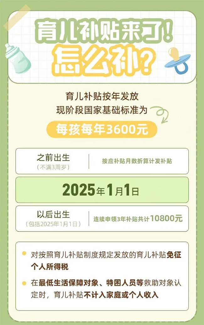 國務院辦公廳8月5日印發《關于逐步推行免費學前教育的意見》,明確從2025年秋季學期起,免除公辦幼兒園學前一年在園兒童保育教育費,相應減免民辦幼兒園保育教育費。 一、免保育教育費對象 從2025年秋季學期起,免除公辦幼兒園學前一年在園兒童保育教育費。 對在教育部門批準設立的民辦幼兒園就讀的適齡兒童,參照當地同類型公辦幼兒園免除水平,相應減免保育教育費。 西藏,四川、云南、甘肅、青海四省涉藏州縣,新疆喀什、和田、阿克蘇、克孜勒蘇柯爾克孜四地州等地區在園兒童繼續執行現行政策。 二、免保育教育費標準 按照縣級以上地方人民政府及其教育、價格主管部門批準的公辦幼兒園保育教育費收費標準(不含伙食費、住宿費、雜費等)執行。 民辦幼兒園保育教育費高出免除水平的部分,幼兒園可以按規定繼續向在園兒童家庭收取。 育兒補貼正式全面開放! 3周歲前每孩每年3600元 9月8日,國家衛生健康委舉行新聞發布會。會上介紹,今天開始,育兒補貼申領正式全面開放,可通過支付寶、微信和各省份政務服務平臺線上申領,也可到嬰幼兒戶籍地的鄉鎮政府進行申領。 育兒補貼補貼誰?怎么補?2025年1月1日之前出生、不滿3周歲嬰幼兒補貼怎么發?戳圖讀懂↓↓ 根據方案,從2025年1月1日起,對符合法律法規規定生育的3周歲以下嬰幼兒發放補貼,至其年滿3周歲。補貼對象應當具有中華人民共和國國籍。 換言之,2022年1月1日以后出生的嬰幼兒,無論一孩、二孩、三孩,均可申領育兒補貼。 育兒補貼按年發放,育兒補貼國家基礎標準為每孩每年3600元,至其年滿3周歲。 1.對于2025年1月1日及以后出生的嬰幼兒,可連續申領3年補貼,共計10800元。 2.對于2025年1月1日之前出生且未滿3周歲的嬰幼兒,可按應補貼月數折算補貼金額。 |